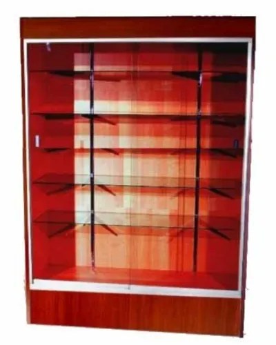 Durable melamine laminate surface. All tempered safety glass. 1/4″ Glass sliding door. 67″ Vertical display area. Five adjustable 12″ glass shelves. Stain finished clear anodized aluminum frame extrusion. Chrome finished standard and bracket. Color matched back panel.